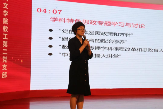 会上,教工第二党支部书记王文奇分享支部“党建+实创”的创新之路。教工第二党支部的党员教师依托传播学科专业特色,将党建与学术交流、专业建设、学科竞赛和实创赛事相结合,找准专业教学与课程思政的融合,实现互促互进。支部党员教师先后指导学生国家级赛事奖项19项,省级奖项28项。2020年,传播学科成功获批硕士学位授予权。支部还主办了钱塘奥斯卡和“我爱我的家乡”作品展等实创赛事,既推动了专业发展,又提升了学生的专业水平。