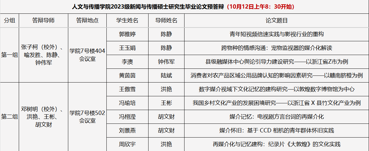 2023级新闻与传播专业硕士学位论文预答辩举行,共有9位研究生参加本次预答辩。为进一步提高研究生学位论文质量,本次预答辩邀请浙江大学张子柯教授、浙江传媒成人韩漫